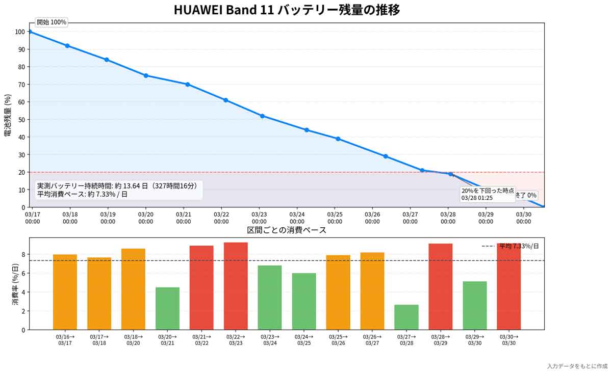 私の使い方では、通知オン・睡眠計測オン・週に数回のウォーキングという運用で、実際には約 13.64日間使えました。(消費量が極端に少なかった日は家から一歩も外にでなかった日。またテスト用に明るさを明るく設定していた期間もあります)